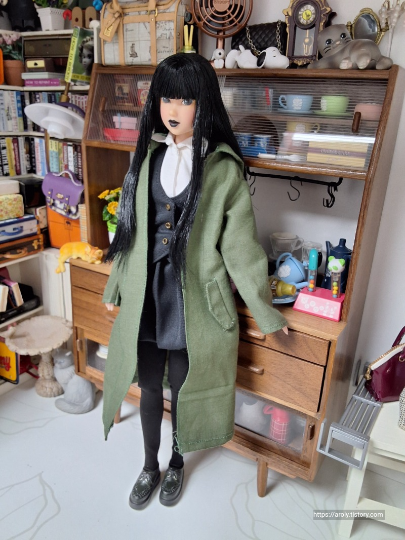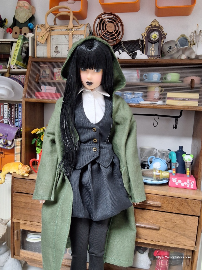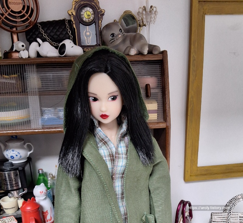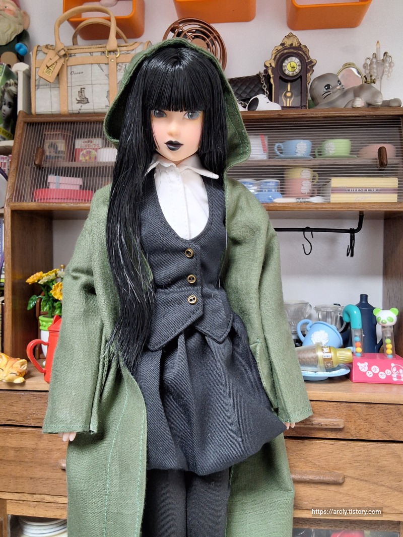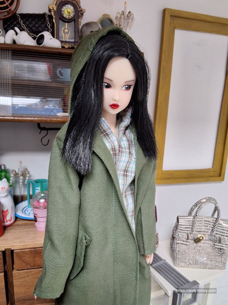 어제 완성한 모즈코트. 인형옷 대전에 있는 코트인데 저번에 떡볶이 코트 만들어 본 이후 언젠가 만들어야지 했던거라 요 며칠 도전 중이었다. 원단 마름질 해서 잘라놓고 이번에는 오버록 기능을 써 보자(물론 오버록 전용보다는 못 하겠지만서도 가정용 미싱에 그 기능이 있다는 게 강점인 거니까)싶어서 올풀림 안 바르고 대기를 탔다. 지퍼를 달았어야 했는데 망쳐서 이대로 버리느냐 했는데 그러기엔 원단이 너무 예쁘고 딱인거라 그냥 이대로 하자 싶었고 며칠 걸린 끝에 어제 완성했다(재봉 자체는 3일에 걸쳐서 했다. 모자부분 몇 시간 사투 끝에 했음. 이번에는 재봉질 신경썼는데도 하자투성이 이긴 하다)